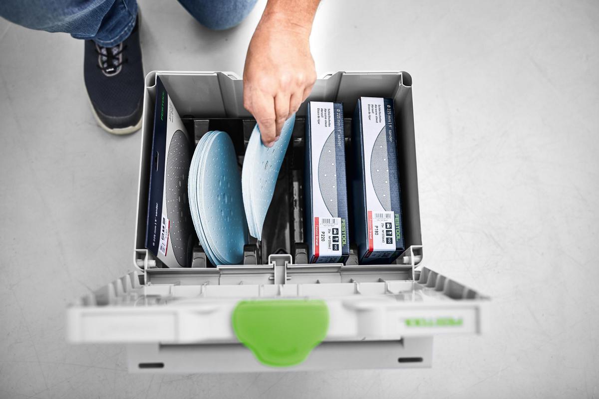 - Hitreje dosežite idealne rezultate: Učinkovito, strukturirano delo omogoča še hitrejše spreminjanje abrazivov in zmanjšuje porabo abraziva. Brusilna sredstva so lahko razdeljena v pet predelkov. Jasno urejeno skladiščenje rabljenih in večkratnih abrazivnih sredstev. Združljiv z vsemi generacijami Systainer, mobilnimi odsesovalniki prahu in številnimi drugimi sistemskimi dodatki.