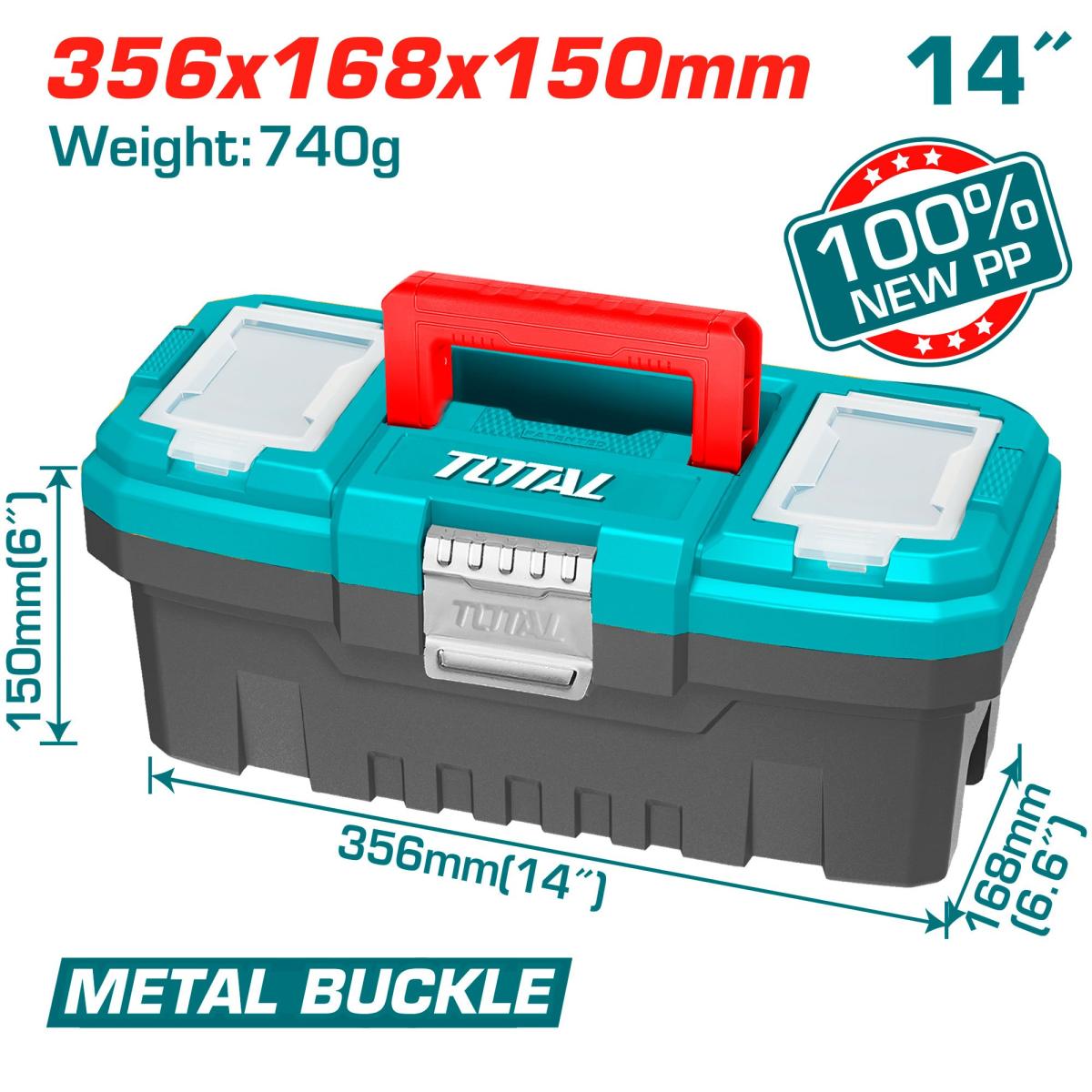 Plastična škatla za orodje velikosti 14 palcev znamke “14” je izjemno funkcionalna in trpežna. Izdelana je iz visokokakovostnega materiala PP, ki zagotavlja dolgo življenjsko dobo. S svojimi dimenzijami 356 mm x 168 mm x 160 mm je dovolj prostorna za shranjevanje različnih orodij.