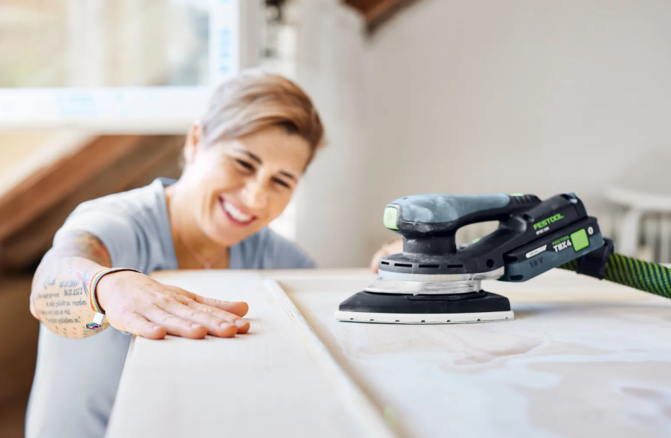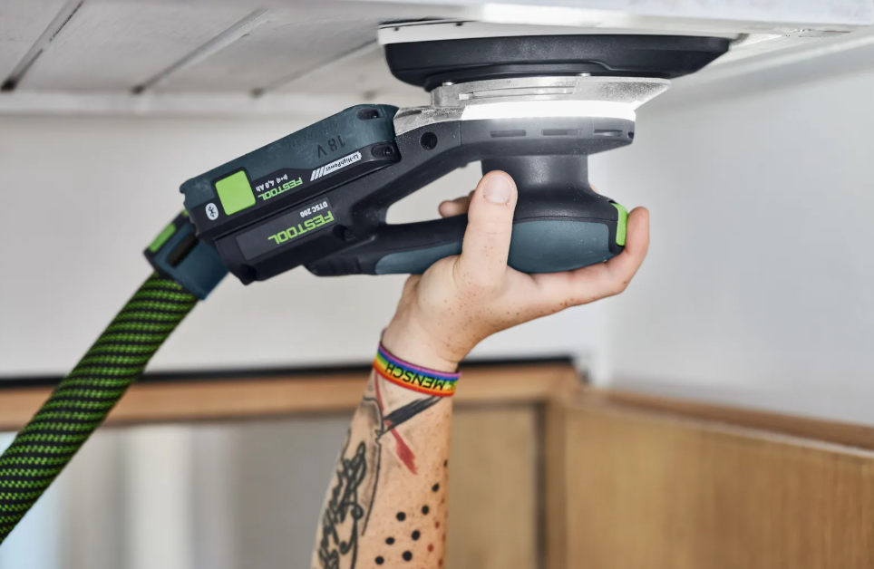 - Več funkcij z aplikacijo Festool: S pametnim telefonom lahko posamično in neprekinjeno zatemnite luč ter prilagodite trajanje osvetlitve – tako lahko površino po brušenju ponovno preverite.