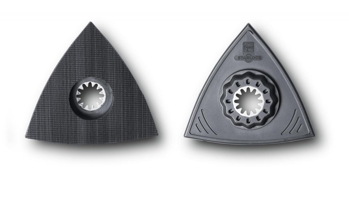 Brusna plošča FEIN za zelo ozke in ploščate odprtine (npr. lamele na omarah, naoknicah). Plastična nosilna plošča za preprečevanje poškodb in madežev na obdelovancu. Trikotna oblika, ploščata izvedba, s sprijemalnim delom.