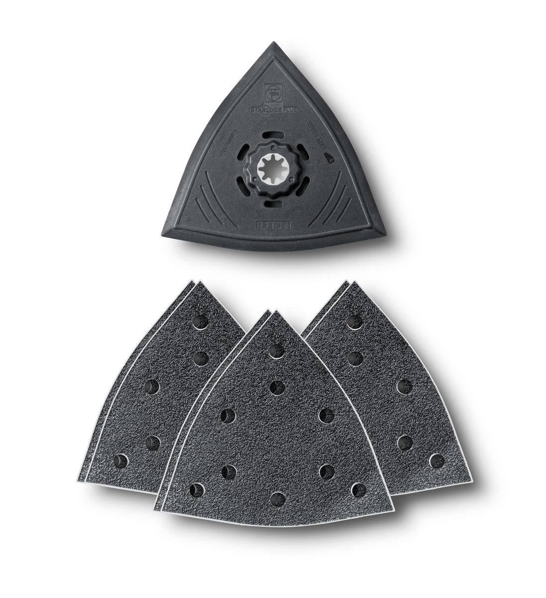 Brusni set FEIN za učinkovito brušenje robnih in kotnih površin ter srednje velikih površin. Alternativa ekscentričnim ali naključnim brusilnikom. Brez povratnega učinka na robovih. Enostaven za uporabo, zelo dobra zmogljivost brušenja. Plastična nosilna plošča preprečuje poškodbe in sledi na obdelovancu.
