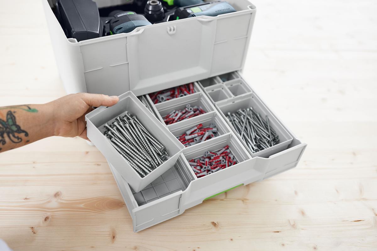Systainer³ Combi prevaža vaše stroje in dodatke v enem Systainerju. Na vrhu je prostor za shranjevanje električnega in ročnega orodja, spodaj pa lahko pospravite ustrezne pripomočke. Systainer³ Combi omogoča varen in učinkovit transport vsega. Predal lahko ločeno razdelite s pregradami ali ločeno dobavljivimi plastičnimi posodami – tako da vedno vidite majhne dele, kot so žeblji, mozniki in vijaki. Vse je pri roki; za boljšo organizacijo in prihranek časa na vašem delovnem mestu.