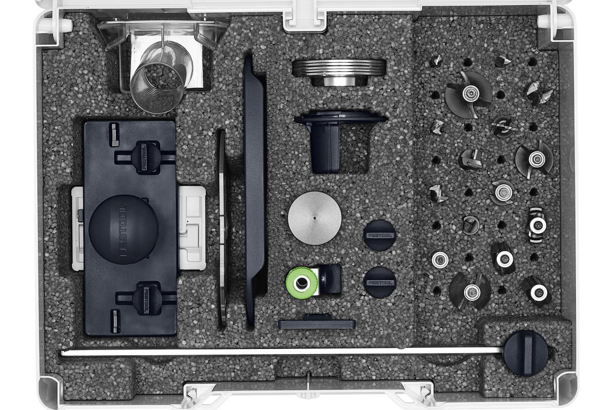 Praktični Systainer³ vsebuje številne pripomočke za vaše aplikacije: adapterje vodilnih tirnic, kopirne obroče, nosilce in še veliko več. Vse je lepo pospravljeno in vedno pri roki. Ima tudi dodatne prostore za vaše usmerjevalnike, tako da so tudi ti optimalno zaščiteni.